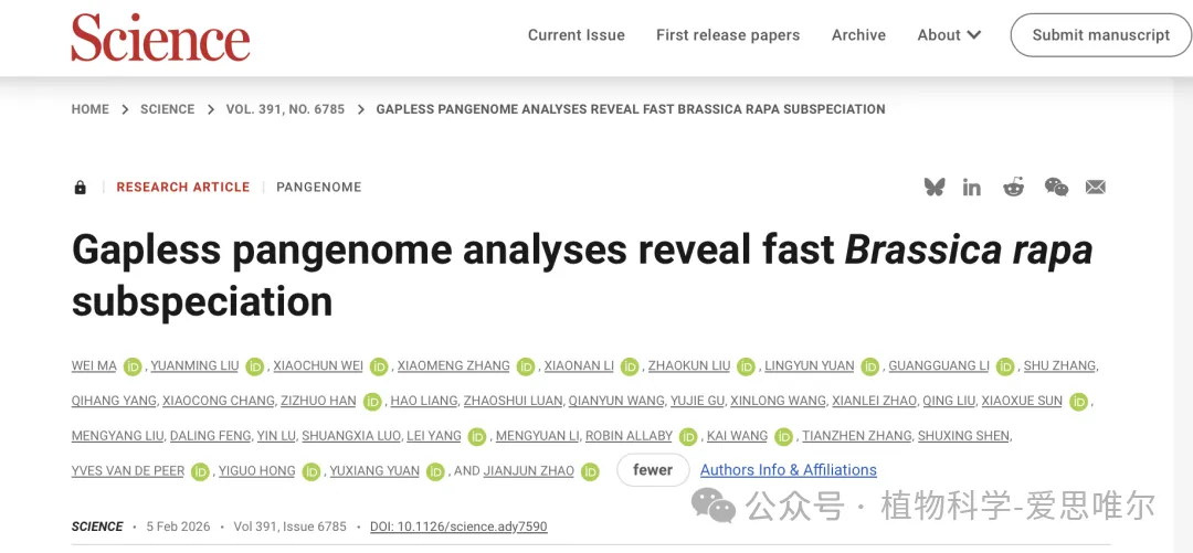 2026年2月5日,安徽农业大学园艺学院十字花科蔬菜团队袁凌云教授与河北农业大学园艺学院赵建军教授团队等国内外10多家单位合作,在国际顶尖学术期刊《Science》(IF=45.8)上发表了题为“Gapless pangenome analyses reveal fast Brassica rapa subspeciation”的研究论文,为破解达尔文提出的“被子植物为何能在地球上迅速崛起、并在极短地质时间内完成爆发式多样化”这一悬而未决的“恼人之谜”提供了新的基因组学视角:以一棵看似普通的白菜(Brassica rapa)为切入口,系统描绘了“白菜王国”如何从一个共同祖先演变为“诸侯并立”的多亚种格局,构建了一个将经典进化问题落地到具体作物系统的基因组学研究范例。