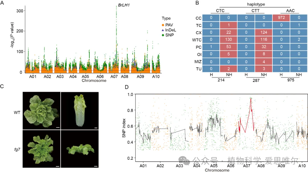 白菜作为我国第一大蔬菜作物,在几千年间演化出大白菜、小白菜、乌塌菜、菜心、芜菁、白菜型油菜等多种形态迥异的变种,恰似一个“诸侯并立”的王国,是研究物种快速分化的典范,也是探究“达尔文之谜”的重要模式物种。研究团队通过对1720份白菜种质进行重测序,精选7个亚种11份“诸侯”代表性材料进行端粒到端粒(T2T)完整基因组组装,并识别出110个着丝粒,同时挖掘到5个与物种形成和分化密切相关的着丝粒特异卫星重复序列。在此基础上,结合31份白菜基因组构建泛基因组,系统解析了着丝粒重塑与大规模结构变异对白菜亚种快速分化的共同作用;并通过泛基因组关联分析与突变体功能验证,锁定控制叶球形成的关键基因BrLH1,将具体亚种的形成与泛遗传变异直接关联起来,为理解被子植物实现快速多样化提供了基因组学支撑。