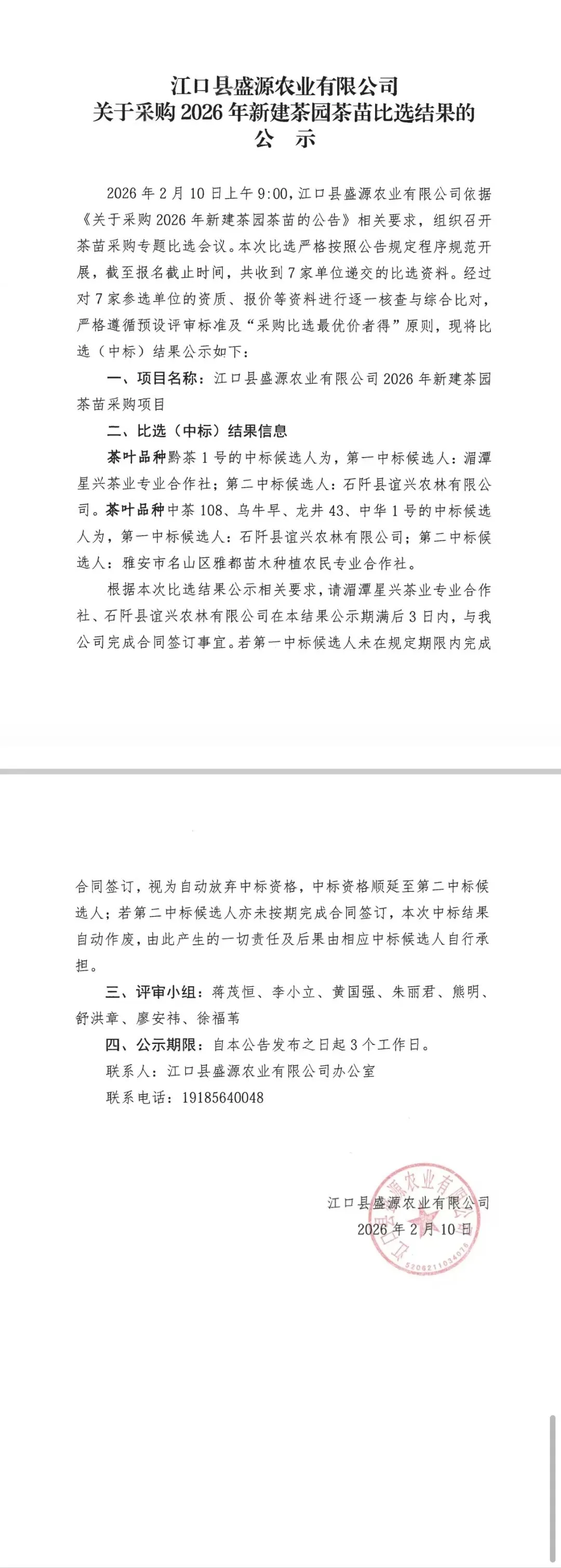 >江口县盛源农业有限公司关于采购2026年新建茶园茶苗比选结果的公示