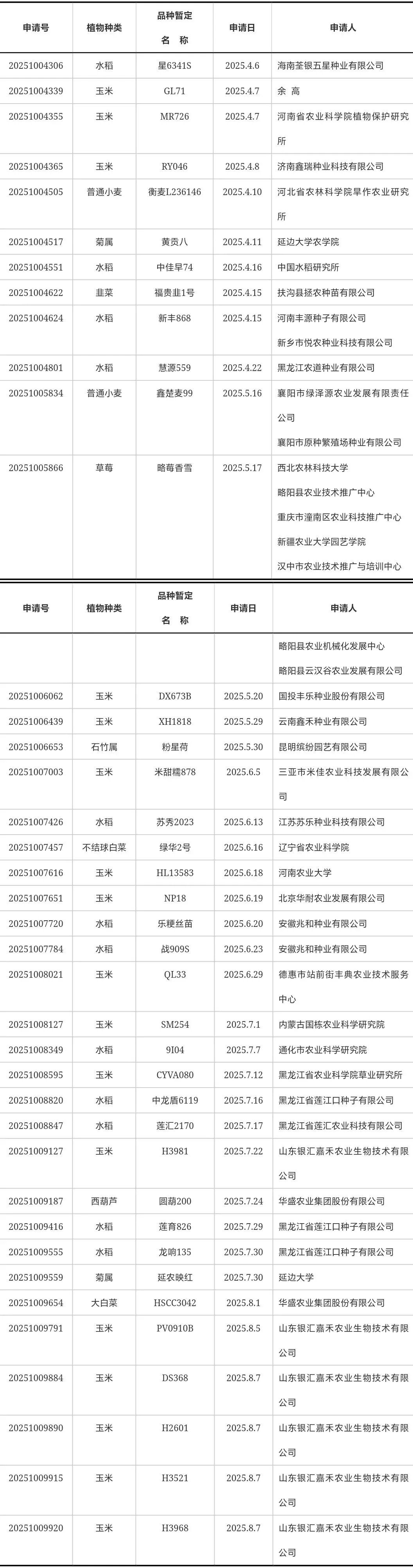 (1)经审查,下列品种权申请不符合《中华人民共和国种子法》第九十条新颖性的规定,依据1997年10月1日起施行的《中华人民共和国植物新品种保护条例》第二十八条、第三十一条的规定,以及2025年6月1日起施行的《中华人民共和国植物新品种保护条例》第二十九条、第三十二条的规定予以驳回。