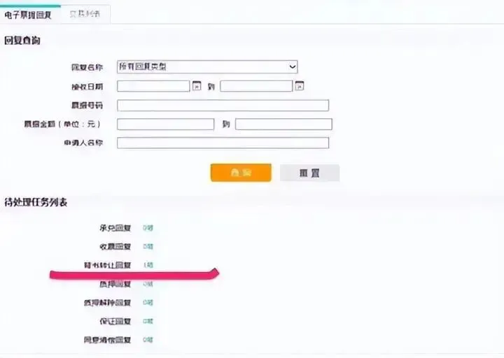 第三步:进入“电子票据回复”窗口,在回复名称中选择“所有回复类型”,再点“查询”,在待处理任务列表中,点击“背书转让回复”右边的“1笔”。