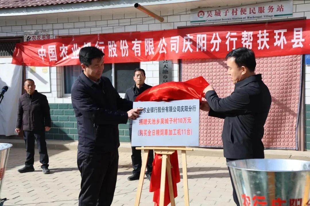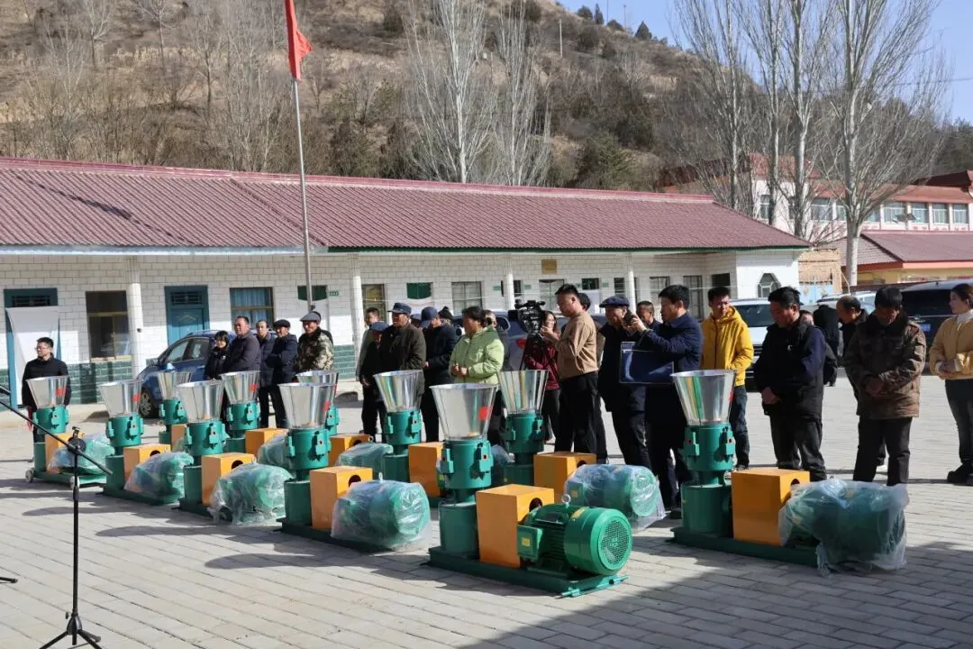 白俊虎与张中行共同为捐赠机具揭牌,11台全日粮饲草加工机正式交付吴城子村使用。