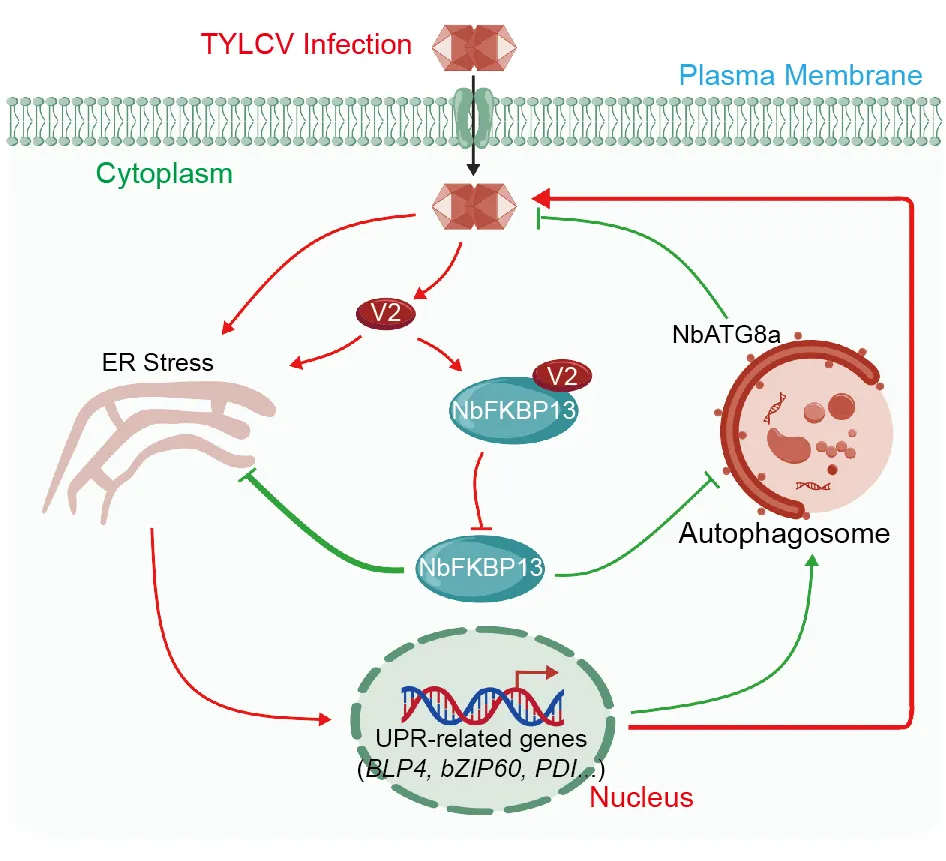 研究发现,TYLCV侵染及其编码的V2蛋白均可激活寄主UPR通路,且UPR的激活利于病毒侵染。进一步研究表明,V2与蛋白折叠过程中的重要限速酶NbFKBP13直接互作,并改变NbFKBP13的亚细胞定位及抑制其肽基脯氨酰顺反异构酶(PPIase)活性。遗传学分析显示,NbFKBP13负调控V2诱导的细胞死亡,并显著增强本氏烟对TYLCV的抗性。这一机制在番茄中同样存在。此外,研究发现TYLCV侵染和V2表达均可诱导自噬反应,其中NbFKBP13起着至关重要的作用,且自噬的激活抑制了TYLCV侵染。