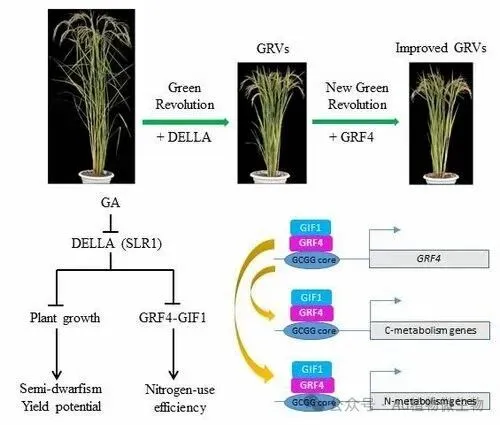 上世纪60年代的第一次“绿色革命”通过引入半矮秆基因,大幅提高了小麦和水稻的收获指数,有效避免了高肥条件下植株倒伏的问题,使全球粮食产量翻倍。然而,这类品种中高水平的DELLA蛋白虽抑制了株高,却也削弱了植物对氮肥的敏感性。该研究揭示,GRF4作为赤霉素信号通路中的关键元件,能与DELLA蛋白直接互作;赤霉素通过降解DELLA蛋白,释放GRF4的转录激活能力,从而同步提升叶片的光合固碳效率与根系的氮吸收能力,实现碳-氮代谢的动态平衡。这一机制不仅从分子层面阐明了“绿色革命”高产品种为何伴随氮效低下,更提供了切实可行的改良策略。