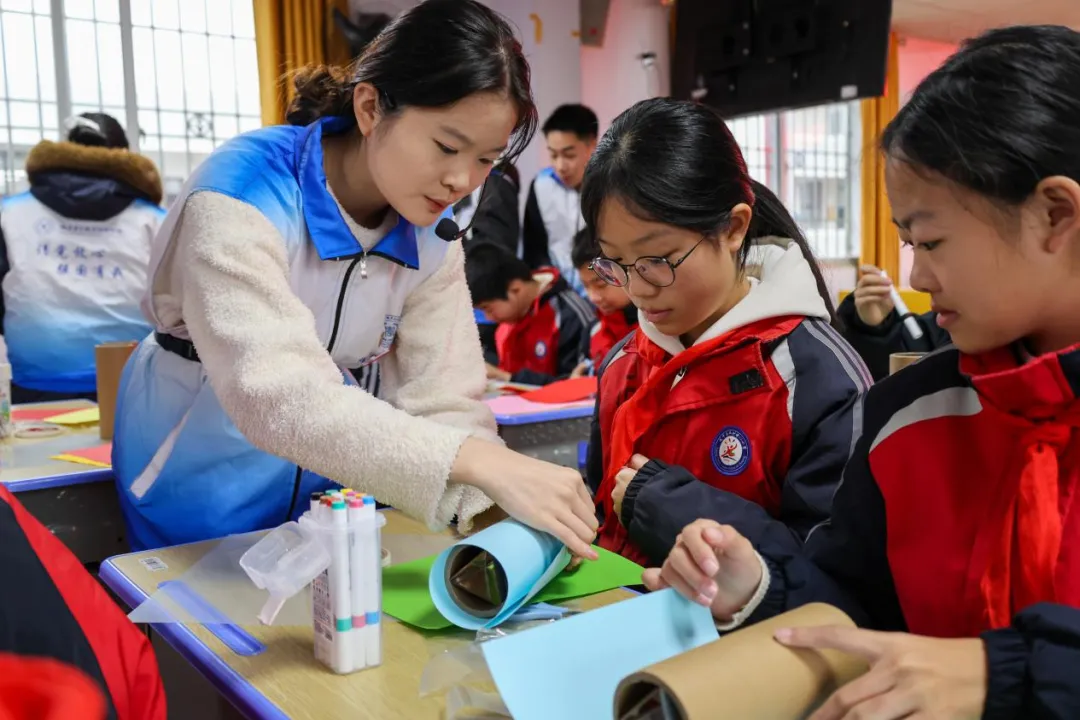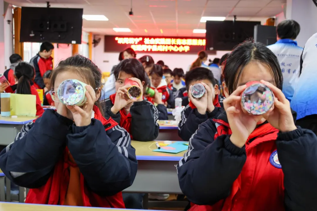 实践团将历史悠久的益智玩具—万花筒带到了孩子们面前。队员们深入浅出地讲解了其背后“光学反射”的科学原理,将这个被誉为“掌中星辰宇宙”的奇妙装置从抽象概念转化为可触摸的组件。在实践团成员的悉心示范与引导下,小朋友们拿起三棱镜片小心嵌入筒身,再放入斑斓的彩色碎片,最后密封镜盖。调试、旋转、观察……当孩子们迫不及待地将眼睛贴近自制的万花筒,无数绚烂对称的图案瞬间绽放。轻轻转动筒身,流光溢彩,变化无穷。一张张小脸上写满了发现奇迹的喜悦。小朋友们在创造独一无二视觉诗篇的过程中,真切感受到了科学原理与艺术形态结合所产生的无限魅力。