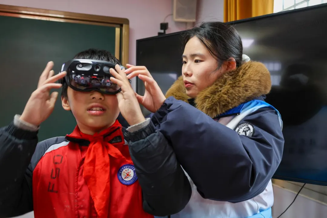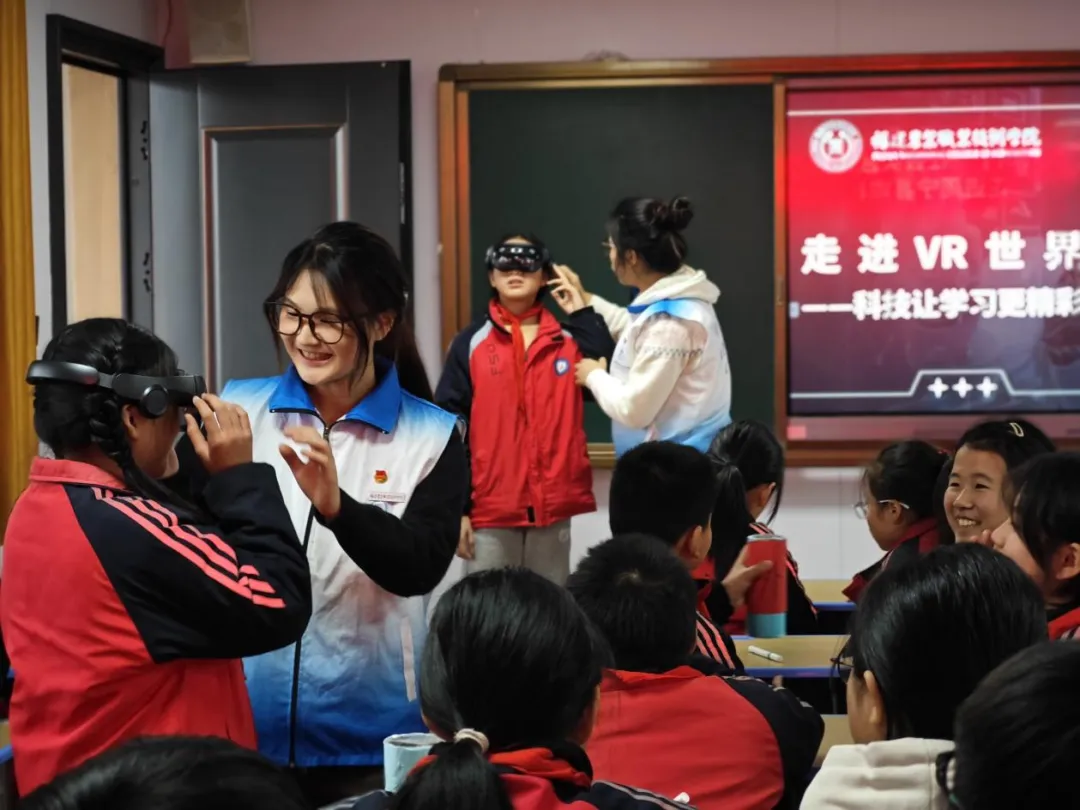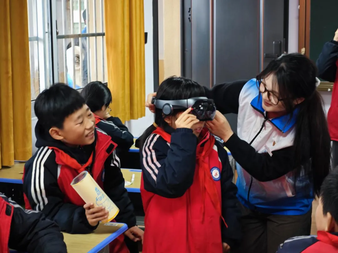 紧随传统光学之美,从有限的物理镜像视觉感知延伸至无限的可交互的平行现实。实践团又将大学专业特色的VR(虚拟现实)技术体验带进课堂。队员们细致演示了VR眼镜的操作,并帮助孩子们佩戴好设备。顷刻间,现实的课堂边界被打破,孩子们的视野穿越时空:他们“漫步”于浩瀚的星际,璀璨星系触手可及;又“潜游”至神秘的深海,与缤纷的珊瑚和鱼群擦肩而过;还能“探访”震撼的史前世界,庞然大物般的恐龙在身旁漫步。在沉浸式的数字场景中,孩子们情不自禁地伸手“触摸”光影,转身环顾四周,发出阵阵惊叹与欢快的笑声。