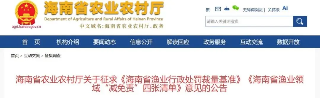 为规范我省渔业行政处罚裁量权,推进包容审慎行政执法,进一步优化渔业领域法治化营商环境,我厅起草了《海南省渔业行政处罚裁量基准》和《海南省渔业领域“减免责”四张清单》(包括不予行政处罚清单、从轻行政处罚清单、减轻行政处罚清单、不予行政强制措施清单》,现向社会公开征求意见,并就有关事宜公告如下: