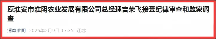 2026年2月9日,一则来自“清廉淮阴”的通报在淮安当地引发广泛关注:原淮安市淮阴农业发展有限公司总经理吉荣飞,因涉嫌严重违纪违法,正接受淮阴区纪委监委的纪律审查和监察调查。这一消息,不仅揭开了一位曾站在区域农业发展前沿的国企高管的落马序幕,也再次为国有企业廉洁治理敲响警钟。