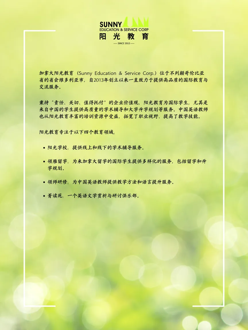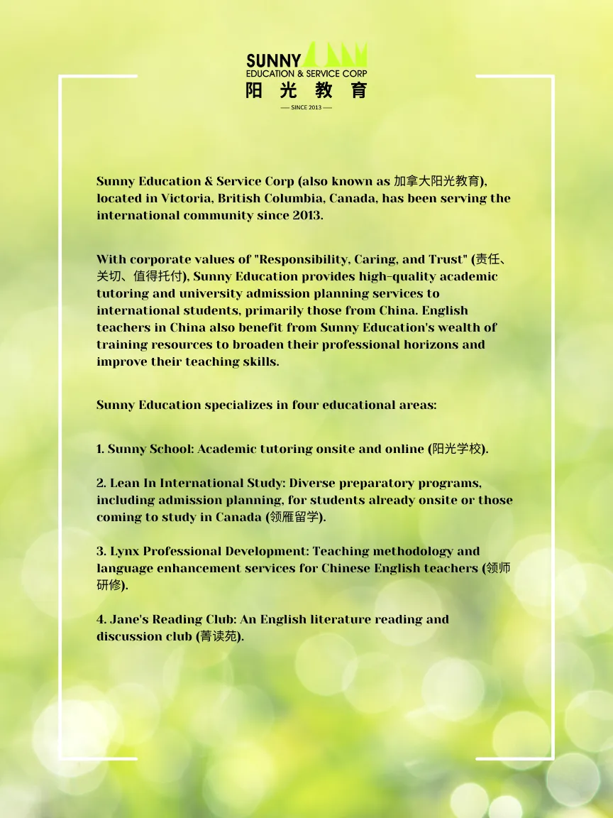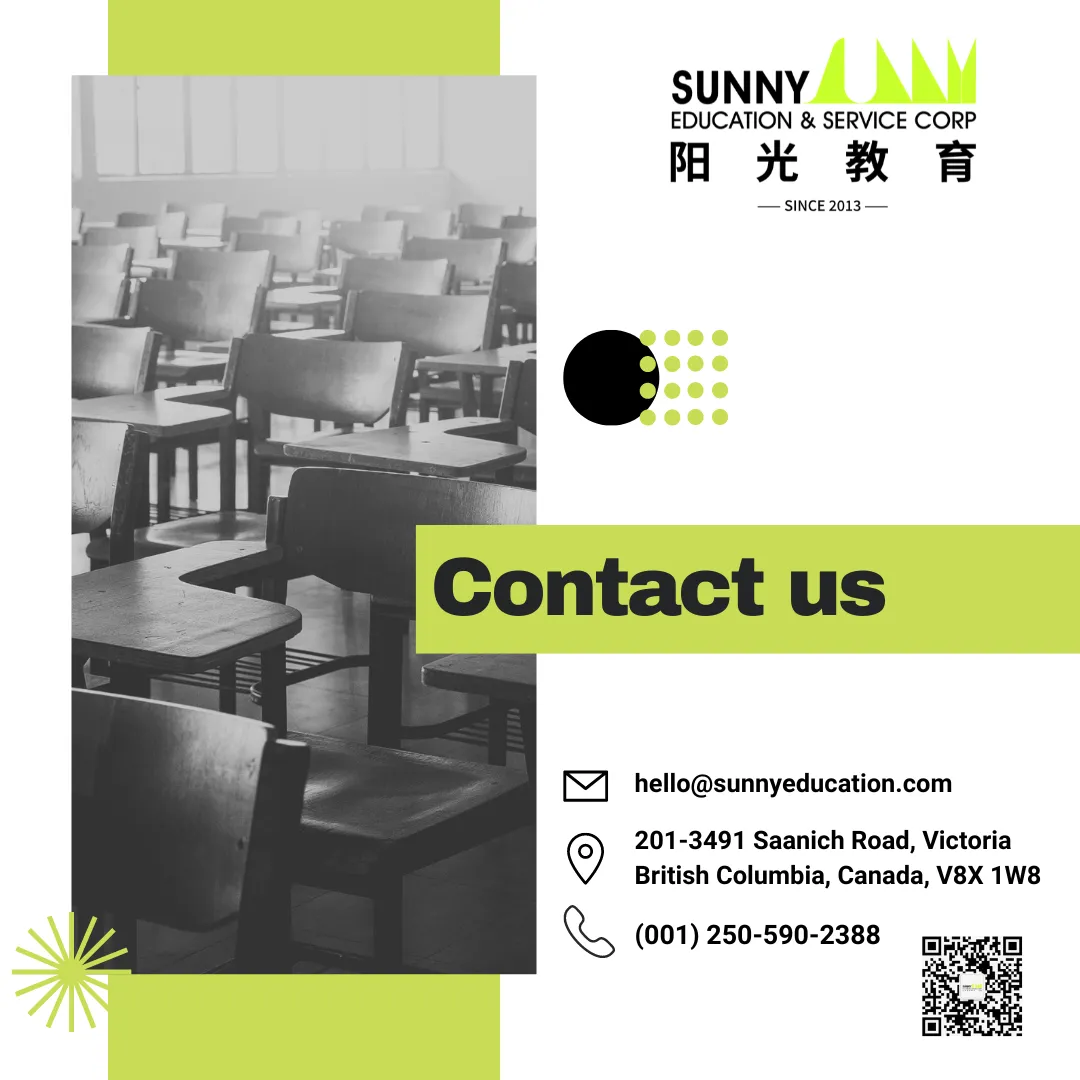 📱 电话: (001) 250 590 2388💬 微信: SunnyEducationCanada🏢 地址: 201-3491 Saanich Road, Victoria (Uptown区域)📧 邮箱: hello@sunnyeducation.com