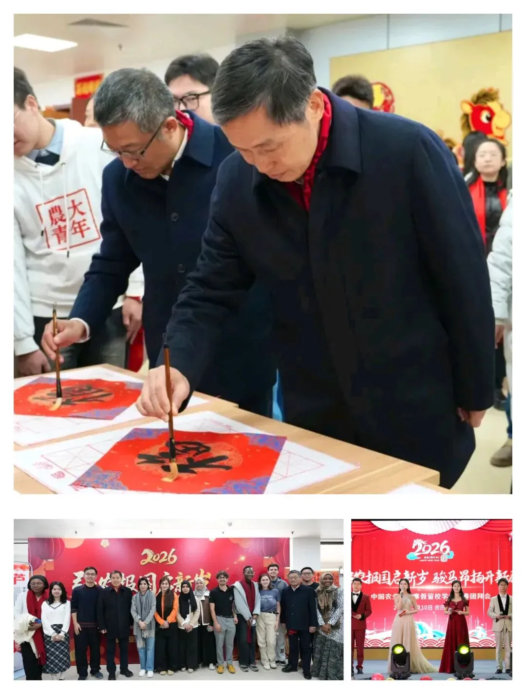 2月10日,中国农业大学2026年寒假留校学生新春团拜会欢乐举行。学校党委书记钟登华,校长陈卫,党委副书记、纪委书记、国家监委驻中国农业大学监察专员单际国,党委副书记杨志,副校长张永生等与寒假留校的师生们欢聚在东校区一号学生公寓三层招聘大厅,欢送巳蛇、喜迎午马。团拜会开始前,钟登华、陈卫共同写下福字送给全校师生,与留校学生们留下辞旧迎新的合影,与师生们一起包着幸福团圆的饺子,活动现场洋溢着欢声笑语和家的温暖。资料来源:中国农业大学