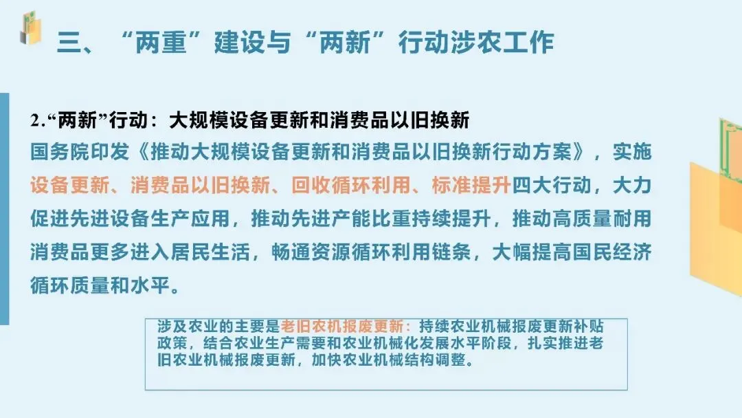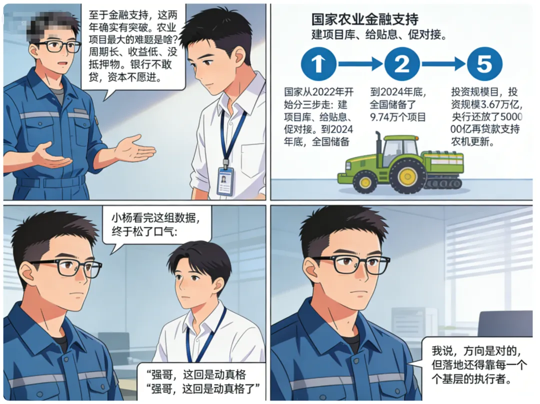 国家从2022年开始分三步走:建项目库、给贴息、促对接。到2024年底,全国储备了9.74万个项目,投资规模3.67万亿,央行还放了5000亿再贷款支持农机更新。