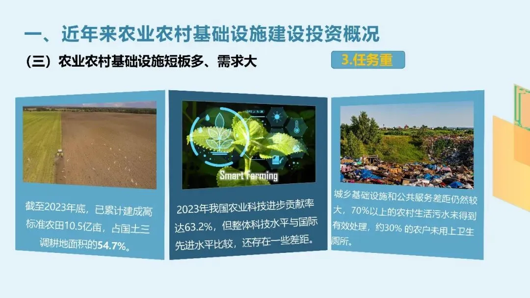 4.77亿农村人口,19.18亿亩耕地,高标准农田才建了一半出头,70%的农村污水还在直排,30%的农户连卫生厕所都没有。