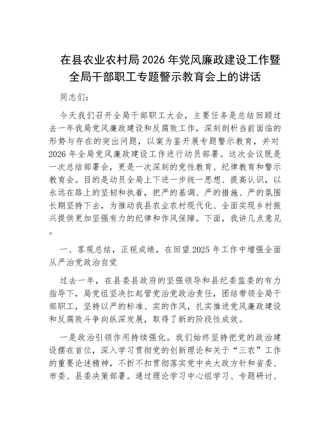 >在县农业农村局2026年党风廉政建设工作暨全局干部职工专题警示教育会上的讲话