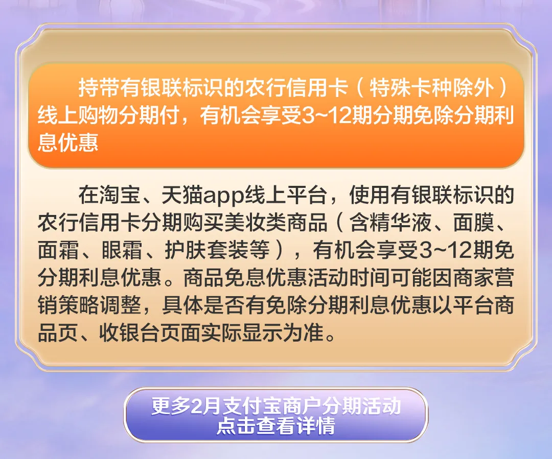 农行哇宝年货节 · 淘宝分期购美妆享3-12期免息!【WOW好物】