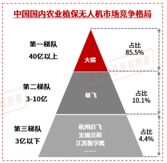 从市场竞争格局来看,大疆创新以超过85%的市场份额占据绝对主导地位,稳居行业龙头;极飞科技市占率约为10%,目前专注于精准农业细分领域;此外,杭州启飞、无锡汉和、江苏数字鹰等企业凭借差异化竞争策略参与市场,整体形成“头部主导、腰部延展、区域品牌补充”的行业结构。