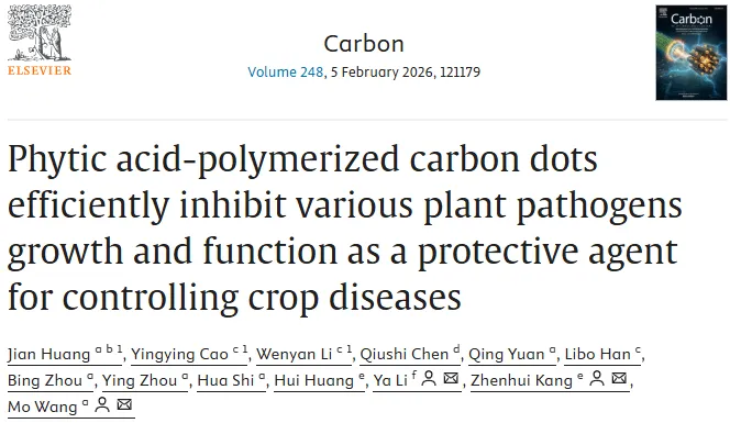 近日,云南农业大学植物保护学院王莫课题组在国际著名碳材料期刊Carbon(IF=11.6)上发表题为“Phytic acid-polymerized carbon dots efficiently inhibit various plant pathogens growth and function as a protective agent for controlling crop diseases”的学术文章,系统揭示了植酸碳点纳米材料抑制植物病原真菌和细菌的作用机理及其在作物病害防控中应用潜力。