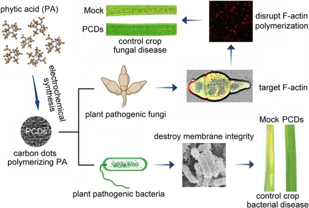 研究团队进一步发现,75μg/mL的PCDs对于各种作物病原细菌生长的抑制率近乎达到100%,而同浓度的植酸溶液的抑制率仅为20%左右。通过扫描电镜观察发现,利用75μg/mL的PCDs处理水稻白叶枯菌24小时后,菌细胞膜出现异常褶皱;当处理到48小时后,白叶枯菌细胞表面产生外向延伸的凸起并伴随细胞膜破裂和菌细胞死亡。这些结果表明,对于植物病原细菌,PCDs通过干扰细胞膜的完整性进而发挥抑菌作用。有研究表明,结合在细菌外膜上的二价金属离子,如Mg2+,可以稳定细菌表面的脂多糖以维持其细胞膜的完整性。因此研究人员推测,PCDs在渗透进入细菌细胞过程中,对其表面金属离子的螯合作用破坏了细菌细胞膜的完整性,进而起到抑制细菌生长的作用。值得关注的是,PCDs具有较强的稳定性。当利用PCDs在接种前12小时喷施处理各类作物幼苗,可有效防控水稻稻瘟病、胡麻叶斑病、白叶枯病、小麦白粉病、番茄细菌性斑点病的发生。因此,该项工作所研发的植酸碳点材料通过干扰真菌细胞骨架actin filament的聚合以及破坏细菌细胞膜的完整性,表现出广谱的抑菌活性,并可以作为一种保护型制剂应用于各类作物真菌和细菌病害的防治。