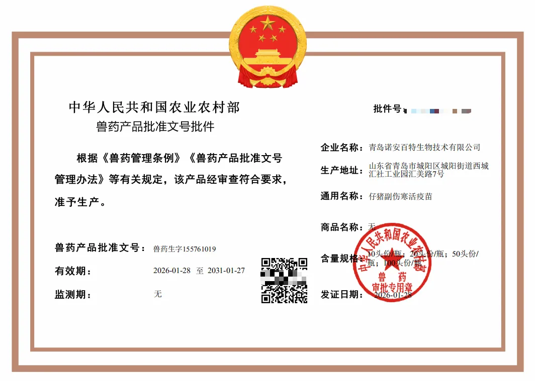 近期我司接连两大批件落地 —— 鸭传染性浆膜炎、大肠杆菌病二联灭活疫苗(2 型 RABYT06 株 + O78 型 ECBYT01 株)与仔猪副伤寒活疫苗的兽药产品获批准文号,这不仅标志着诺安百特在兽用疫苗领域实现关键突破,更为我国养殖业减抗替抗事业注入强劲动力,彰显了企业在农业生物治疗领域的领先实力。