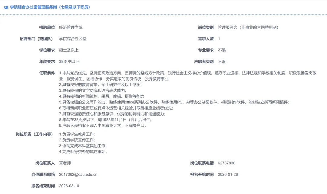 >中国农业大学经济管理学院招聘管理岗1人,3.10截止