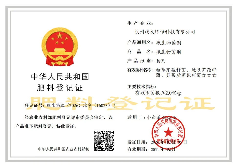 近日,楠大在肥料研发与生产领域再传佳音——公司申请的三款微生物肥料产品,正式通过农业农村部肥料登记评审委员会审定,获颁《肥料登记证》。这标志着杭州楠大在农业微生物技术领域的专业实力再次获得国家权威认可,为绿色农业发展再添科技动力。