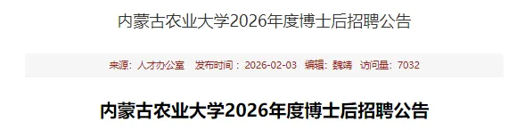 内蒙古农业大学2026年度招聘博士后公告