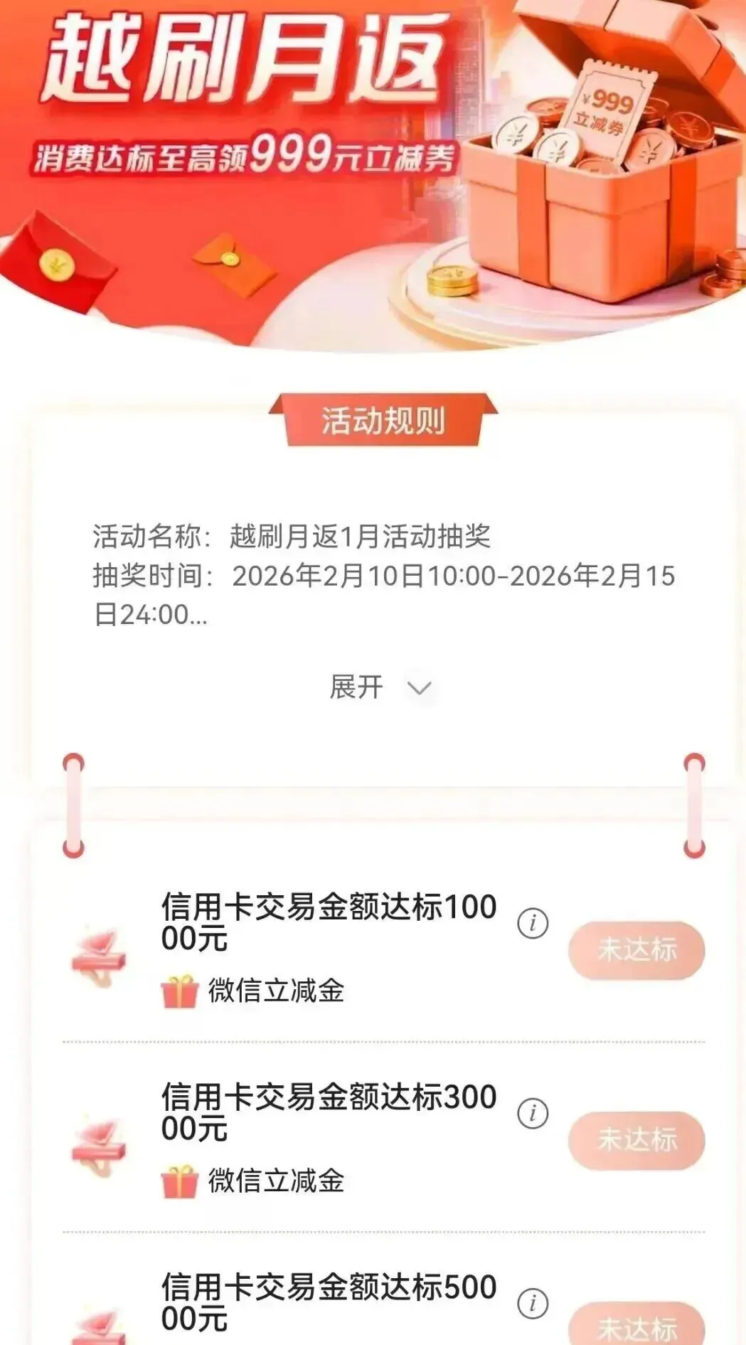 中国银行信用卡越刷月返1月达标的可以抽奖了,2月份也还有活动记得报名报名后当月通过银联标识信用卡消费,累计交易金额达标10000元/30000元/50000元且当月消费至少5笔即可于次月10日10:00参与抽奖。奖品包括:一等奖(999元微信立减金券包,共计400份),二等奖(399元微信立减金券包,共计1800份),三等奖(99元微信立减金券包,共计6400份),四等奖10元微信立减金(共计80000份)。累计交易金额达标50000最高有机会中一等奖,累计交易金额达标30000最高有机会中二等奖,累计交易金额达标10000最高有机会中三等奖。微信立减金限中国银行信用卡在相应渠道支付使用