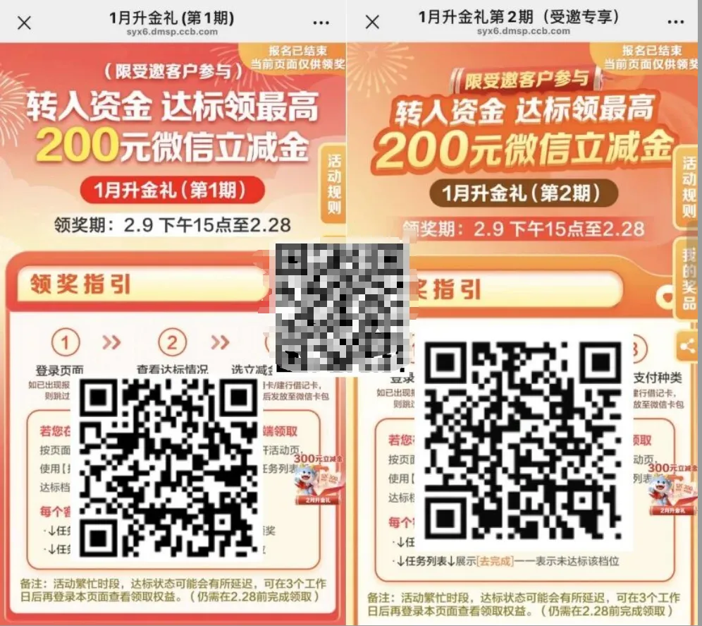 中国建设银行储蓄卡用户1月升金达标的记得领微信立减金,总共2期,但是发了报名有参与的自行看下达标的是哪个档位,每期最高是200元立减金,合计400元。