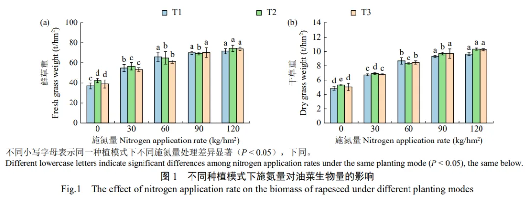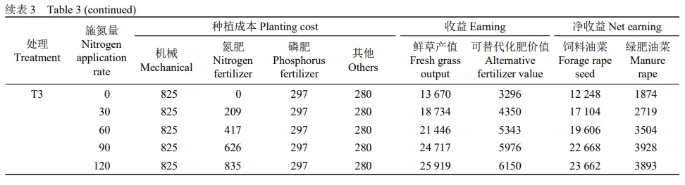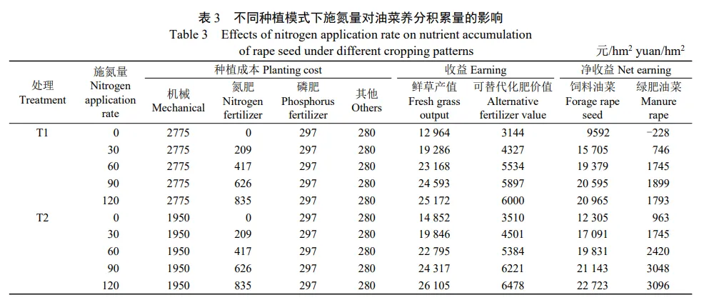 摘 要 为明确麦后复种油菜的适宜种植模式和施氮量,在内蒙古达拉特旗开展田间试验,在3种种植模式秸秆移走翻耕(T1)、秸秆还田翻耕(T2)和秸秆移走免耕(T3)下设置5个施氮量梯度(0、30、60、90和120 kg/hm2),以油菜生物量、养分积累量和经济效益为依据研究适宜的氮肥用量。研究结果表明,T2处理的油菜地上部生物量、碳和钾积累量均高于T1和T3处理,T2处理下各施氮处理的鲜草重、干重、碳积累量和钾积累量平均可以达到60.5 t/hm2、8.0 t/hm2、2981kg/hm2和253kg/hm2。施氮量显著影响油菜生物量和养分积累量,在本试验施氮量范围下油菜生物量和各养分积累量均随着施氮量的增加而提高,与不施氮相比,施氮量为30 kg/hm2时油菜地上部鲜草重和干草重分别增加39.8%和35.1%;施氮量60 kg/hm2时分别增加63.0%和67.9%;施氮量90 kg/hm2时分别增加78.1%和89.0%;施氮量120 kg/hm2时分别增加86.5%和98.1%,油菜绿肥各养分积累量随播种量变化的趋势与生物量基本一致。不同种植模式和施氮量下不同用途的油菜投入成本和产出不同,综合考虑不同模式下不同用途油菜的生物量和养分积累量、经济效益等因素,小麦收获后油菜可以采用麦秸移走免耕方式种植,在油菜做青贮饲料时适宜的施氮量为120 kg/hm2,做油菜绿肥时适宜施氮量为90 kg/hm2。