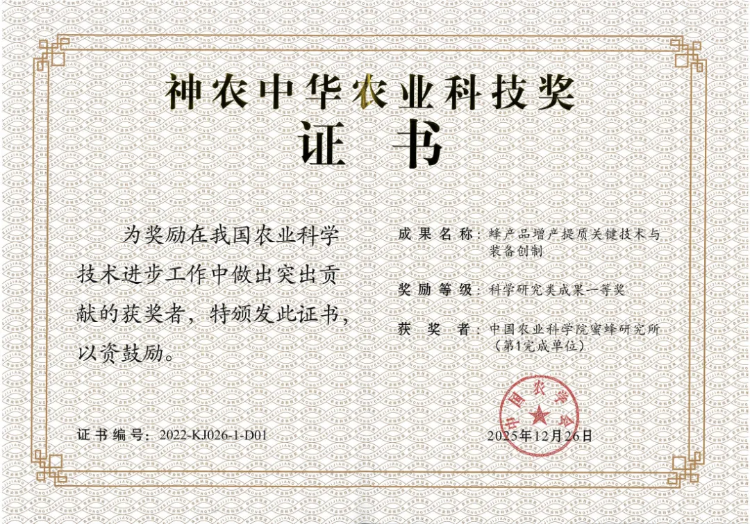 近日,中国农业科学院蜜蜂研究所主持完成的科研成果《蜂产品增产提质关键技术与装备创制》荣获2022-2023年度神农中华农业科技奖科学研究类成果一等奖,由蜜蜂所与中国农业大学、贵州省农业科学院等9家单位共同完成。