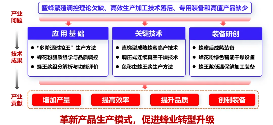 该成果针对我国蜂蜜生产模式落后、蜂花粉品质劣变严重、蜂王浆保鲜加工技术及装备缺乏等产业痛点问题,建立了“多阶适时控王”生产方法,研创了“直梯”型多箱体成熟蜂蜜高产技术,成熟蜂蜜增产50%以上,革新了我国蜂蜜生产模式;开展了蜂花粉绿色智能干燥装备的研制,攻克了蜂花粉干燥能耗高,产品品质差的产业难题,推动了蜂花粉干燥品质调控理论创新;开展了蜂王浆低温保鲜加工关键技术及装备的研创,取得了“理论、技术、专利、装备、产品、标准”一体化的突破性成果。