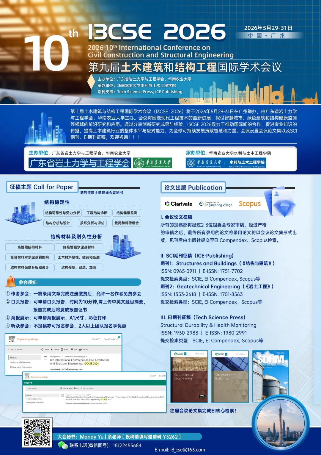 第十届土木建筑与结构工程国际学术会议(I3CSE 2026)将于2026年5月29-31日在广州举办,由广东省岩土力学与工程学会、华南农业大学主办。随着城市化进程加快和基础设施需求增加,土木工程面临着新材料、智能建造、可持续发展以及抗震设计等多重挑战和机遇。