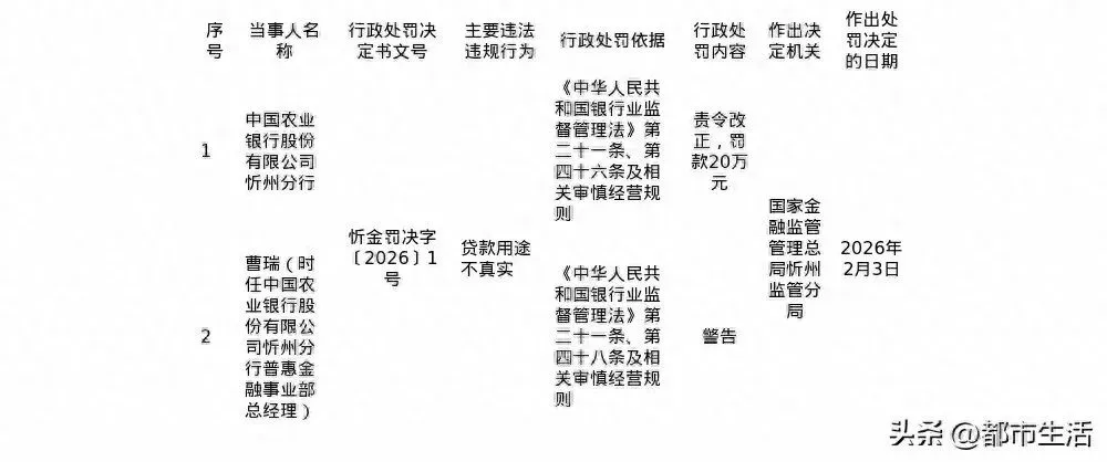 2月10日讯,近日,国家金融监管管理总局忻州监管分局发布了一则行政处罚决定,剑指中国农业银行股份有限公司忻州分行及相关责任人。