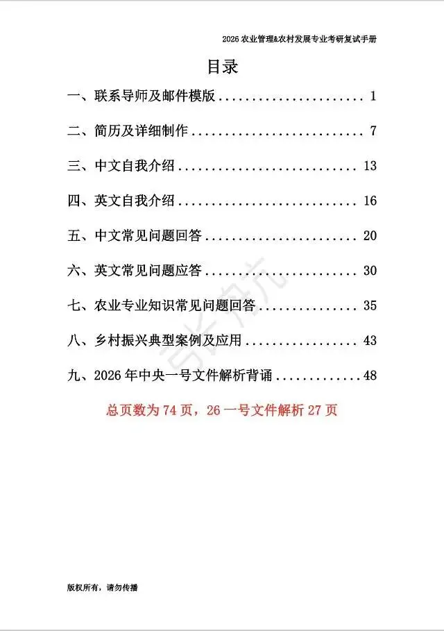 本书作为一本复试指导手册,重点围绕复试的通用流程与备考策略展开,系统阐述了如何有效联系导师、沟通时的注意事项、简历撰写要点,以及中英文自我介绍准备等基础环节。在去年版本的基础上,本次手册进行了全面升级:新增了乡村振兴相关案例,帮助大家在面试中结合实际展开论述;补充了近30 个专业热点问题的参考答案;同时,对 2026 年中央一号文件进行了详细解读,以助力大家更高效、有针对性地进行复习。(以下为部分截图和购买方式)