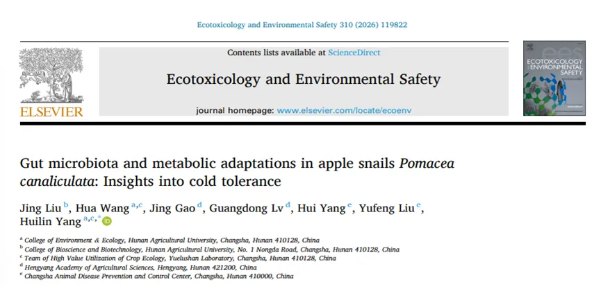 J Liu, H Wang, J Gao, GD Lv, H Yang, YF Liu, HL Yang. Gut microbiota and metabolic adaptations in apple snails Pomacea canaliculata: Insights into cold tolerance. Ecotoxicology and Environmental Safety. 2026. 310: 119822.