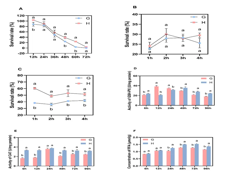 在0℃冷胁迫下,高纬度组福寿螺的存活率显著高于低纬度组(图1A)。高纬度组在5℃冷胁迫和随后0℃处理后的存活率明显更高(图1C),表明福寿螺抗寒性有纬度差异性。此外,冷胁迫下高纬度组福寿螺的GSH-PX和CAT酶活性显著高于低纬度组(图1D,E)。在冷胁迫72和96小时后,高纬度组福寿螺的FFA水平显著提升(图1F)。