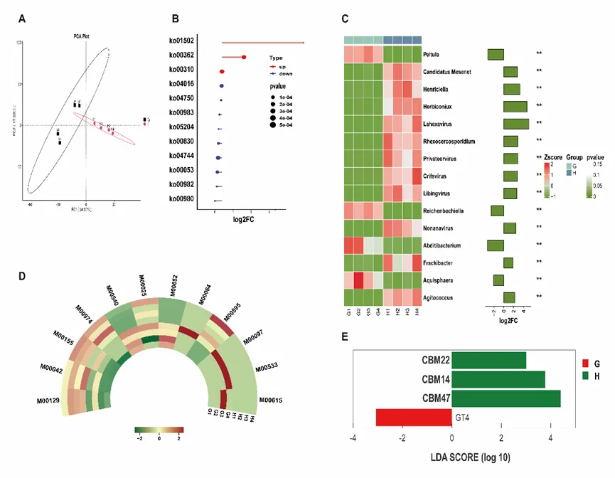 图2 冷胁迫对不同纬度地区福寿螺肠道微生物群落结构组成的影响。A:高纬度组和低纬度组福寿螺肠道微生物群的主成分分析图。MetagenomeSeq分析显著富集的KEGG通路(B)和模块(D)。C:MetagenomeSeq分析福寿螺肠道微生物属水平的差异。E: LEfSe分析CAZymes显著富集变化。