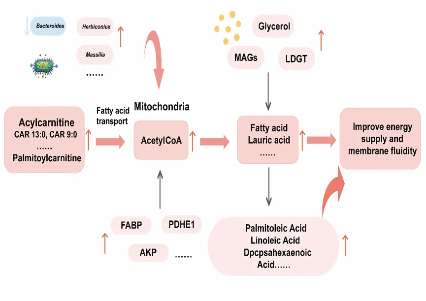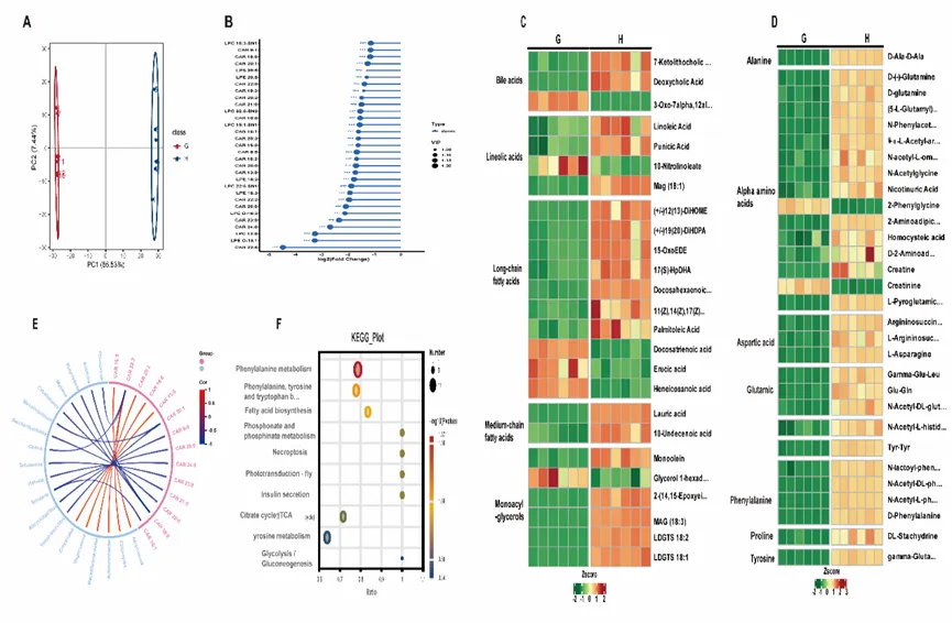 代谢组分析发现,与低纬度组相比,高纬度组有336种差异代谢物(DEMs)上调。PCoA分析证实两组存在显著代谢差异(图3A)。高纬度组中参与脂肪酸代谢和转运的20种酰基肉碱DEMs和11种溶血磷脂DEMs显著上调,包括CAR 16:5、CAR 22:2和LPC 12:0等(图3B)。酰基肉碱与肠道微生物菌群存在显著相关性,如CAR 22:2和CAR 18:0分别与Achromobacter和Vagococcus呈正相关(图3E)。高纬度组的五种不饱和脂肪酸包括亚油酸、二十二碳六烯酸(DHA)等显著上调(图3C)。低纬度组显示28个氨基酸、肽相关DEMs显著降低(图3D)。此外,低纬度组中的抗氧化化合物显著减少。KEGG富集分析表明,大量DEMs参与脂肪酸和氨基酸代谢通路(图3F)。结果表明参与脂肪酸代谢和细胞膜稳定性的抗冻代谢物在不同纬度地区福寿螺上存在显著差异。