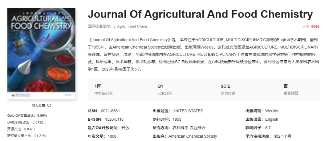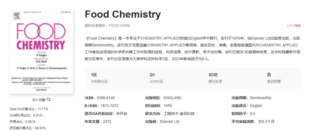 2026推荐理由:1区TOP刊物,收稿范围涉及应用化学、食品科技、营养学等,发文量近4000篇,审稿速度偏慢,时间充裕可以考虑!