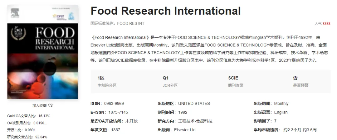 食品科技顶刊,审稿速度非常快,最快22天就能接收,国人发文占比超一半,发表难度一般,着急发表可以尝试!