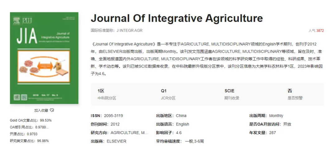 2026推荐理由:老牌农科期刊,位于1区TOP,含金量很高,审稿速度和发表难度都非常可观,录用率81%,可以选择非OA模式,不收版面费