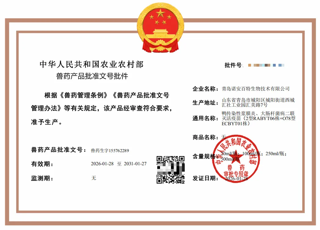 近期我司接连两大批件落地 —— 鸭传染性浆膜炎、大肠杆菌病二联灭活疫苗(2 型 RABYT06 株 + O78 型 ECBYT01 株)与仔猪副伤寒活疫苗的兽药产品获批准文号,这不仅标志着诺安百特在兽用疫苗领域实现关键突破,更为我国养殖业减抗替抗事业注入强劲动力,彰显了企业在农业生物治疗领域的领先实力。