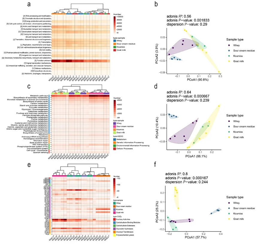 3. 分析发现,样本类型(即乳制品基质)是决定乳酸菌群落分类组成的主要因素,不同乳制品拥有其独特的优势乳酸菌物种;4. 进一步的功能注释分析(COG、KEGG、CAZy)揭示,乳制品基质同样是驱动乳酸菌功能基因差异的关键。来源于不同基质的菌株具有专属的功能基因特征,例如:山羊奶来源的菌株富集了RNA加工和胞外结构相关基因,而乳清来源的菌株则含有更丰富的移动遗传元件。