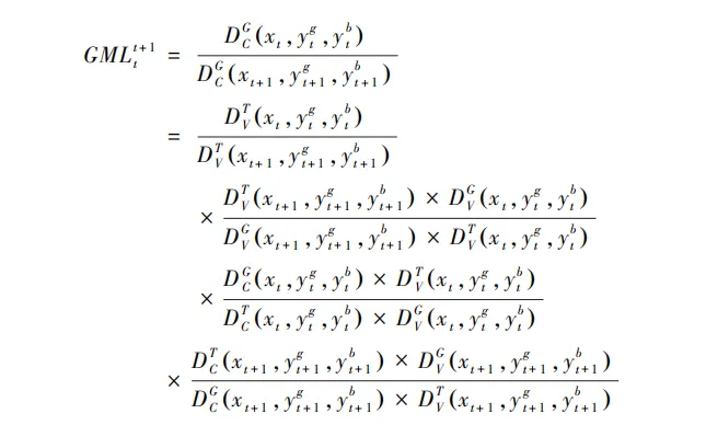 GMLt+1表示决策单元GML指数在t到t+1年变化,DG是基于全局的方向距离函数、DT是基于当期的方向距离函数,下标C表示规模报酬不变,下标V表示规模报酬可变。PEC表示纯效率变化,PTC表示纯技术进步,STC表示规模技术变化,SEC表示规模效率变化。