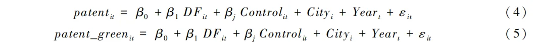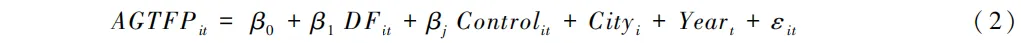 式(2)中,β0为常数项,β1为核心解释变量系数,i,t分别为某个城市和年份,AGTFP为农业绿色全要素生产率,DF为数字金融,Control为各控制变量,Cityi为不随时间变化的城市固定效应,Yeart为不随个体变化的时间固定效应,εit为随机误差项。