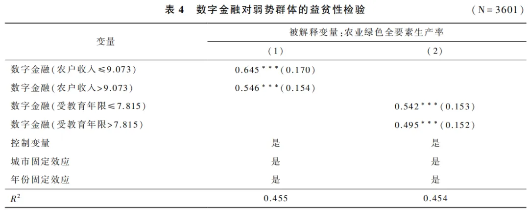 从理论上说,数字金融对弱势群体(在农村,弱势群体主要集中于低收入农户和低人力资本农户)的益贫性主要体现在以下三个方面:一是提高金融服务的可获得性与包容性。数字金融凭借其数字技术优势和普惠属性,显著降低了金融服务的使用门槛和交易成本,使传统金融难以覆盖的弱势群体被纳入正规金融服务体系中。金融服务可得性的提高,使得低收入农户更便捷地获得信贷支持和农业保险等生产性资源,为其采纳绿色农业技术、改善农业生产方式提供了资金支持,从而有助于提高农业绿色生产率。二是缓解信贷约束。数字金融依据大数据、人工智能等技术,能够更精准地识别和评估农户的信用状况与还款能力,克服传统金融服务因信息不对称而导致的信贷配给问题。这使得金融机构能够更有针对性地为不同特征农户提供适配的金融产品,帮助弱势群体解决融资难、融资贵问题,增强其绿色投资的积极性与可持续性。三是促进农业技术扩散与知识溢出。数字平台通过视频、在线培训等低门槛传播方式,使受教育程度较低的农户也能便捷地接触到先进的农业绿色生产技术和管理知识。这种广泛而高效的技术扩散效应,有助于加速农业绿色技术的推广与应用,从而对提升农业绿色全要素生产率产生积极作用。