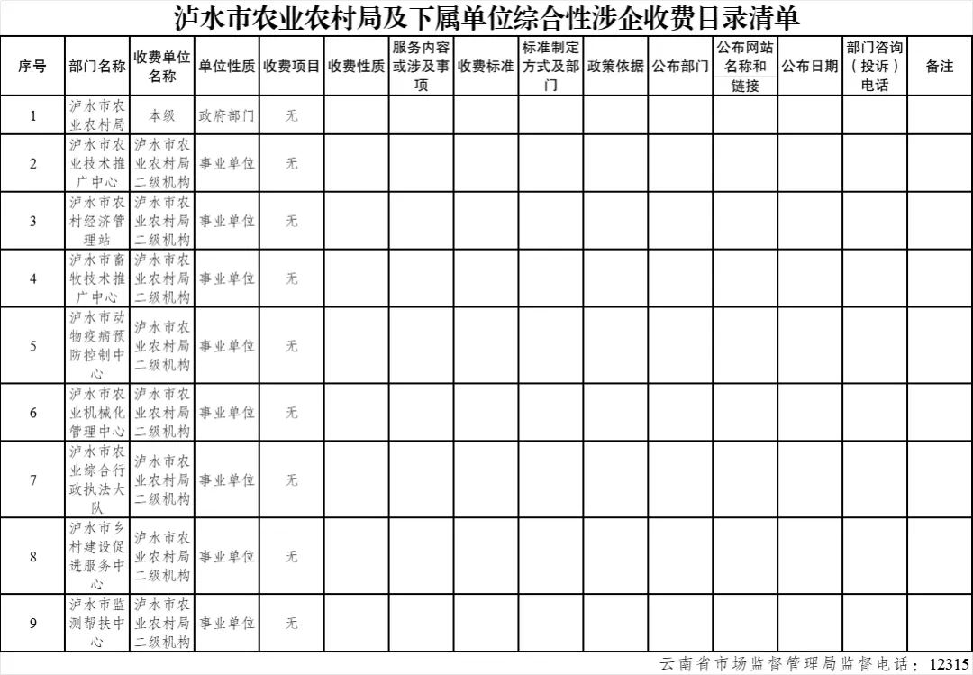 泸水市农业农村局及下属单位综合性涉企收费公示