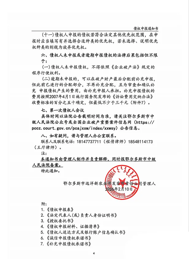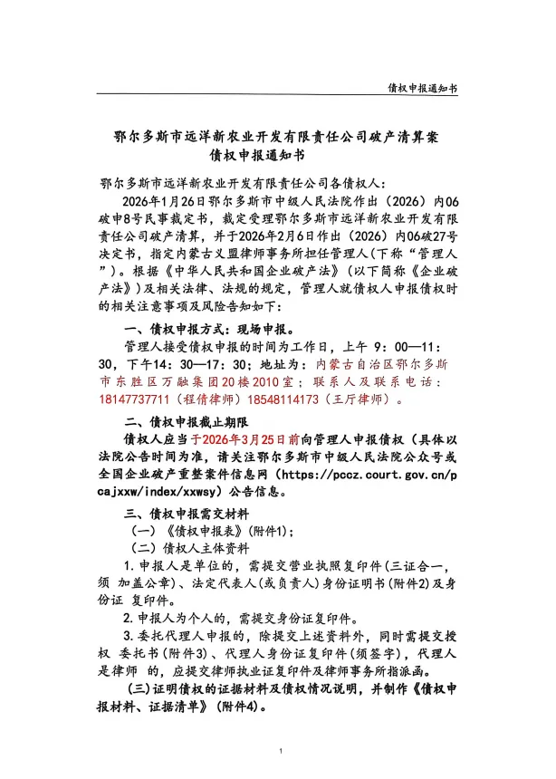 鄂尔多斯市远洋新农业开发有限责任公司破产清算案债权申报通知