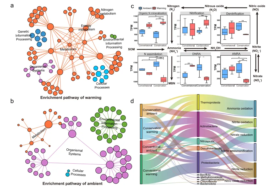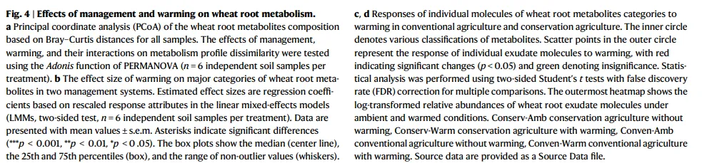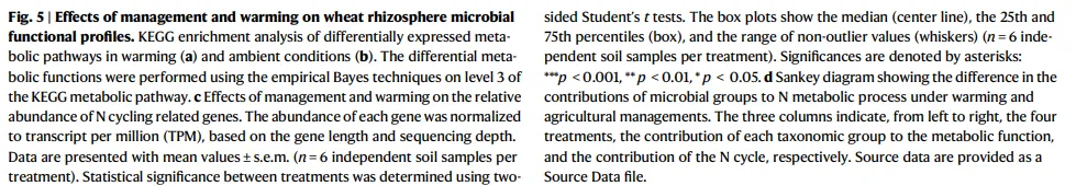利用15N-NO3-和15N - NH4 +原位标记,研究了增温如何影响保育和常规农业中小麦与根际微生物之间的NO3-和NH4+分配。无论农业管理如何,增温持续增加了小麦和根际微生物对NO3-的吸收( p < < 0.001 ; p > 0.001),但NO3-吸收的大小和方向是管理方式特异性的。与环境条件相比,增温使常规农业(双侧Student ' s t检验, t₆ = 7.64 , p < 0.001 )和保护性农业(双侧Student ' s t检验, t₆ = 9.46 , p < 0.001 ;图2a)对NO3-的吸收分别增加26%和40%。由Cohen ' s d可知,增温对小麦NO3-吸收的影响在保护性农业( Cohen ' s d = 6.69 , 95 % CI 2.25 ~ 11.1 vs.d 5.40 , 95 % CI 1.67 ~ 9.13 )中为常规农业( Cohen ' s d = 6.69 , 95 % CI 2.25 ~ 11.1 vs.d 5.40 , 95 % CI 1.67 ~ 9.13 )的1.24倍。相反,与常规农业( Cohen ' s d = 2.83 , 95 % CI 0.39 ~ 5.28 vs.d 4.28 , 95 % CI 1.14 ~ 7.42 )相比,增温对保护性农业根际微生物NO3-吸收的影响小34%。与环境条件( p < < 0.01 ; p > 0.01)相比,增温降低了植物和微生物对NH4+的吸收。其中,小麦(双侧Student ' s t检验, t₆ = -4.43 , p = 0.004)和根际微生物(双侧Student ' s t检验, t₆ = -4.01 , p = 0.007 )在保护性农业增温条件下NH4+吸收量比环境条件下分别减少59%和11%。相比之下,常规农业增温条件下小麦(双侧Student ' s t检验, t₆ = -5.34 , p = 0.002 )的NH4+吸收量比环境条件下低46%,根际微生物(双侧Student ' s t检验, t₆ = -6.05 , p < 0.001)的NH4+吸收量比环境条件下低7%。尽管增温加剧了两种农业系统(用微生物对15N的吸收量与小麦的比值表示)中植物和微生物之间的氮竞争,但与常规农业相比,保护性农业减少了对NO3-的竞争,减少了4.4倍( Cohen ' s d = 5.09 , 95 % CI 1.53 ~ 8.66 vs.d 1.16 , 95 % CI-0.71 ~ 3.03 ),减少了对NH4+的竞争,减少了1.4倍( Cohen ' s d = 4.27 , 95 % CI 1.14 ~ 7.41 vs.d = 3.10 , 95 % CI 0.53 ~ 5.67 )。