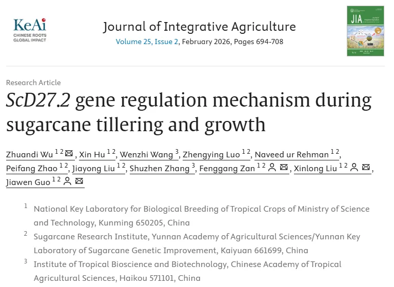 Zhuandi Wu, Xin Hu, Wenzhi Wang, Zhengying Luo, Naveed ur Rehman, Peifang Zhao, Jiayong Liu, Shuzhen Zhang, Fenggang Zan, Xinlong Liu, Jiawen Guo. 2026. ScD27.2 gene regulation mechanism during sugarcane tillering and growth. Journal of Integrative Agriculture, 25(2): 694-708.
