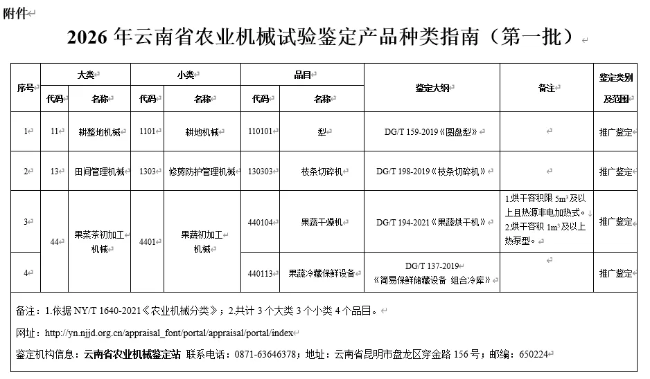当前位置:首页>农业>云南省农业机械鉴定站关于发布《2026年云南省农业机械试验鉴定产品种类指南(第一批)》的通知